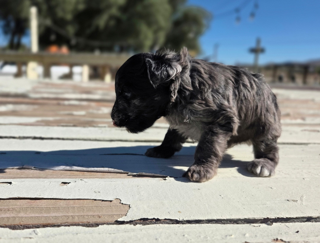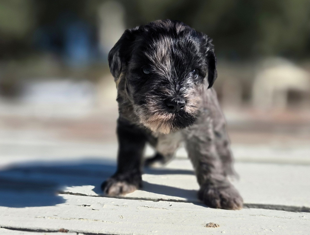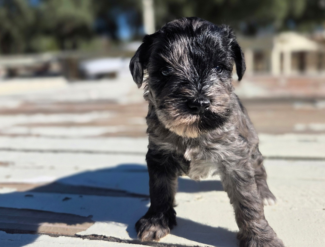 Classic is a handsome, well-mannered male Schnauzer with a rare blue merle coat and the breed’s signature charisma. He carries himself with proud, square carriage and bright, attentive eyes. Classic is a loyal companion who balances playful curiosity with dependable calm.