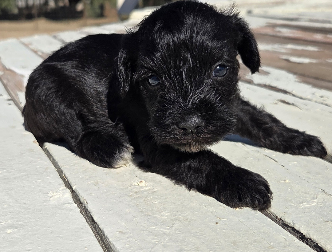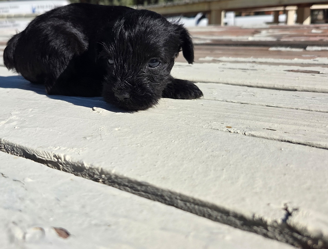 Classic-quiet and jewel-like, this little female runt shines with a glossy, solid black coat and a tender, brave heart. Small in stature but big in personality, she thrives on close companionship and gentle handling.